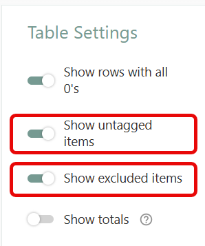 NOTE: Enabling these settings will help you identify any items that did not get tagged, along with any tagged items that may have been incorrectly placed in the Excluded categories.